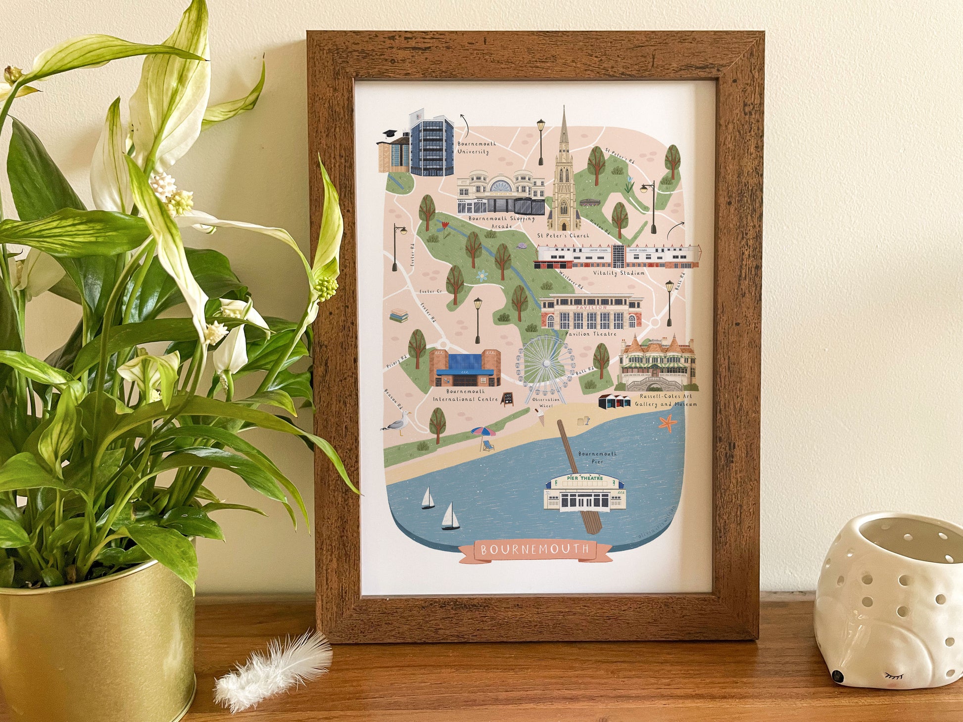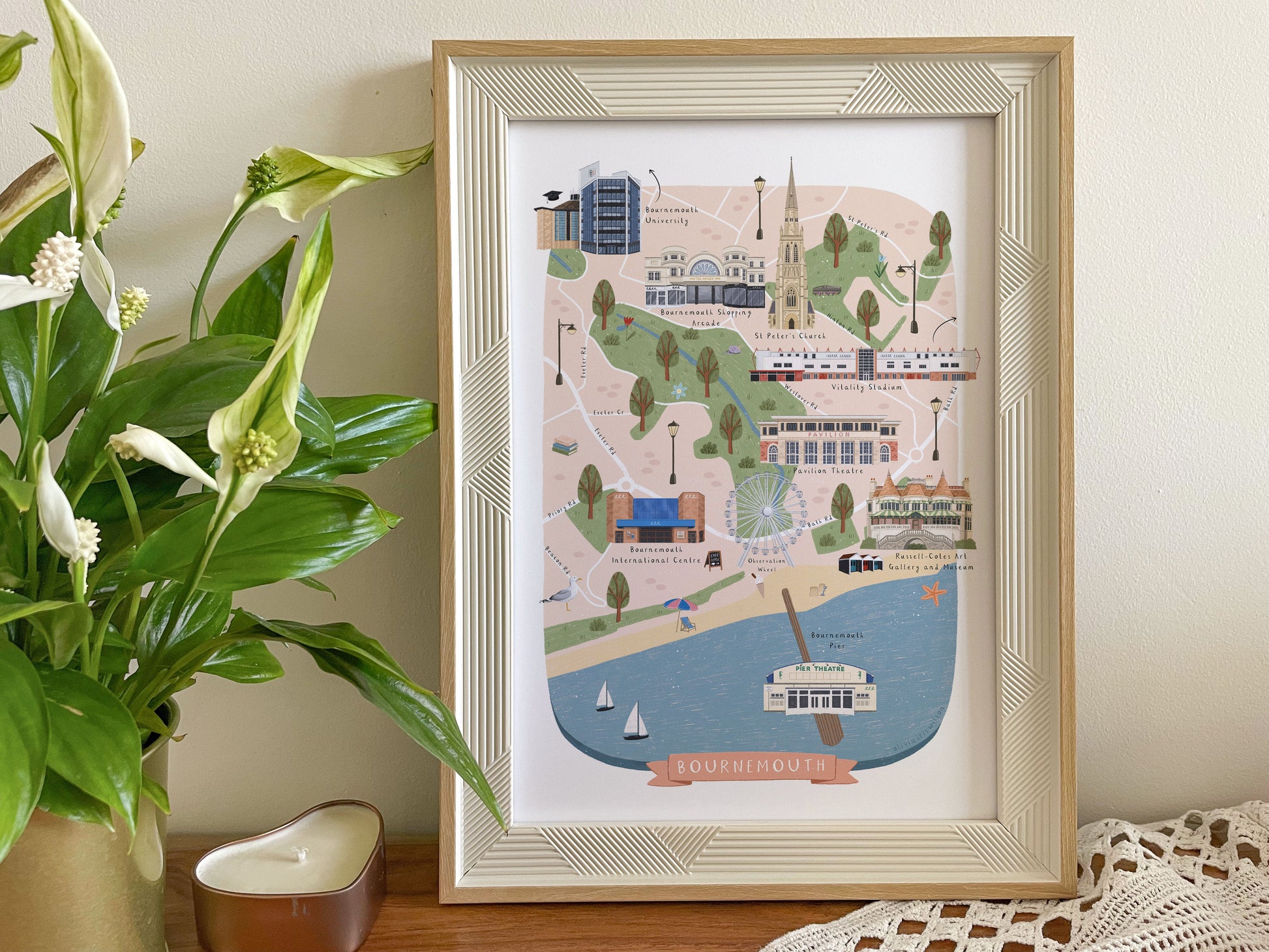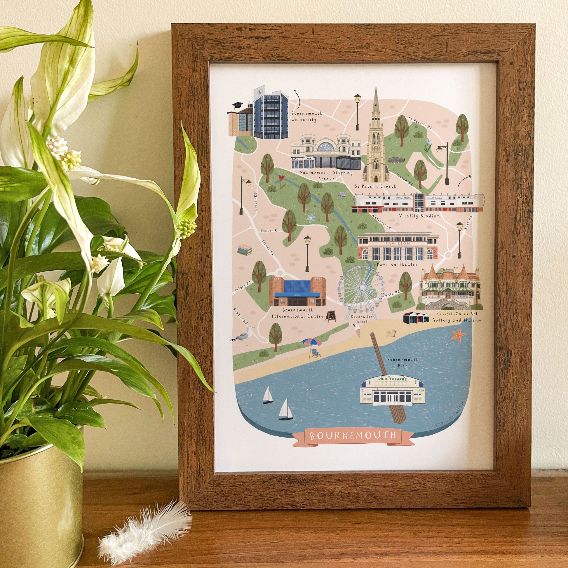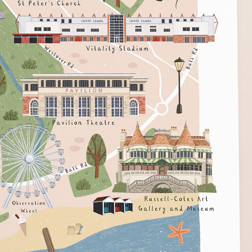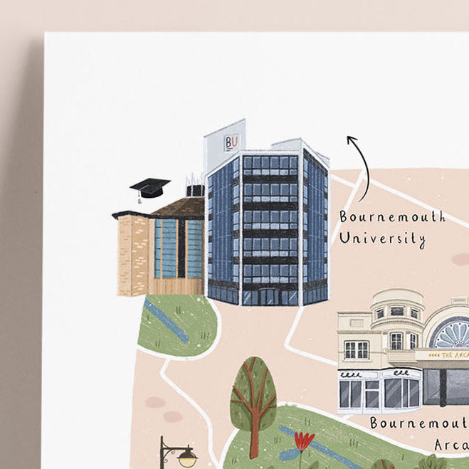 A colourful illustrated map of Bournemouth, showcasing the beautiful landmarks of the city. Showcase this Bournemouth map print in your own home, or give it as a gift to remember Bournemouth by.