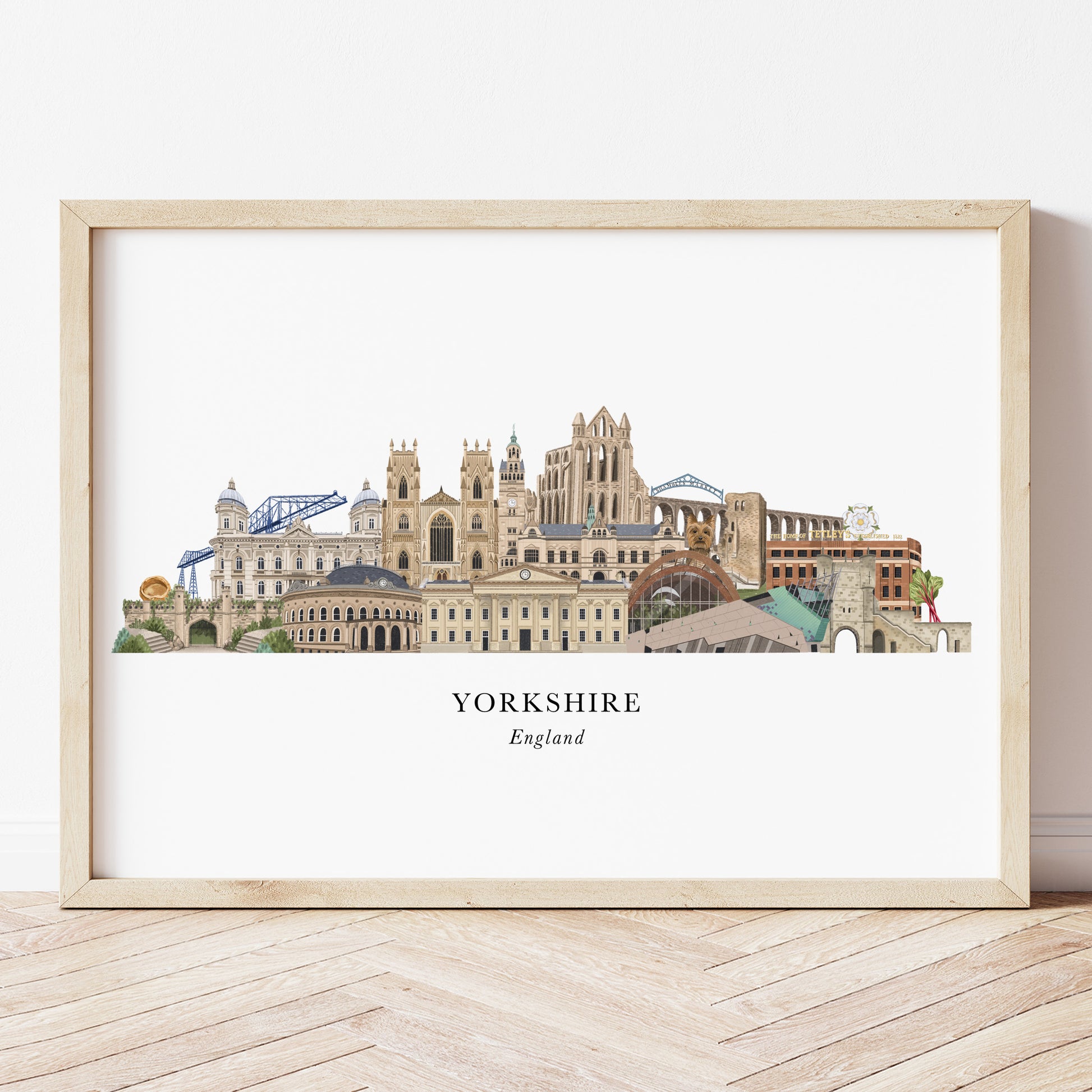 A colourful skyline of Yorkshire, showcasing the beautiful landmarks of the county. Showcase this Yorkshire skyline print in your own home, or give it as a gift to remember Yorkshire by.